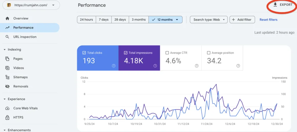 First thing you need to do is to export all your data from Google search console. Click on the export button on the top right.