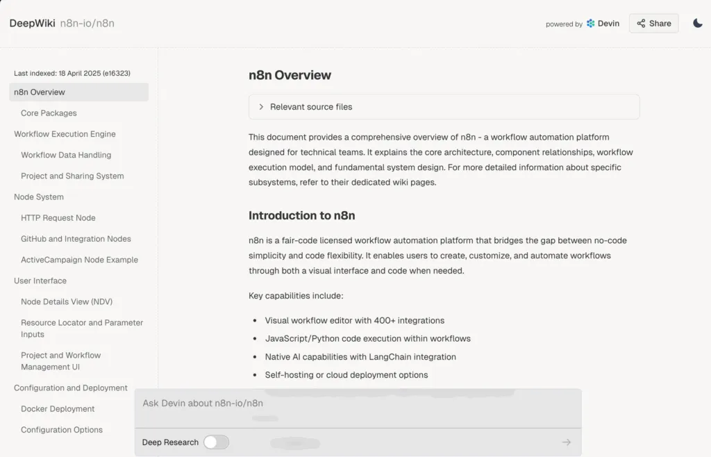 It understands n8n’s source code: DeepWiki doesn’t just know about n8n from documentation – it analyzes the actual implementation.