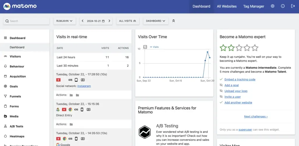 I stumbled upon Matomo when I needed more. Google Analytics wasn’t cutting it anymore. I wanted to see what each visitor was doing.