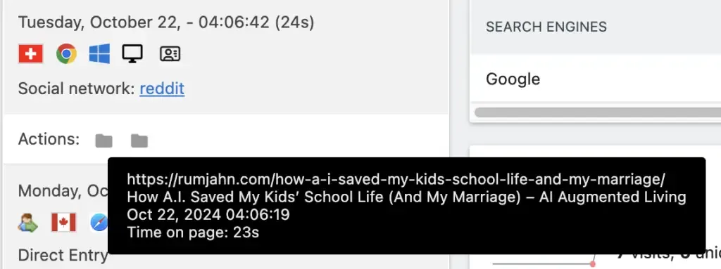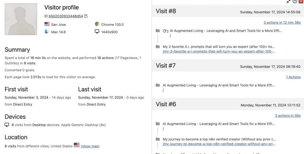 Once up and running, Matomo impressed me. I could see exactly what each visitor was doing. Down to the second.