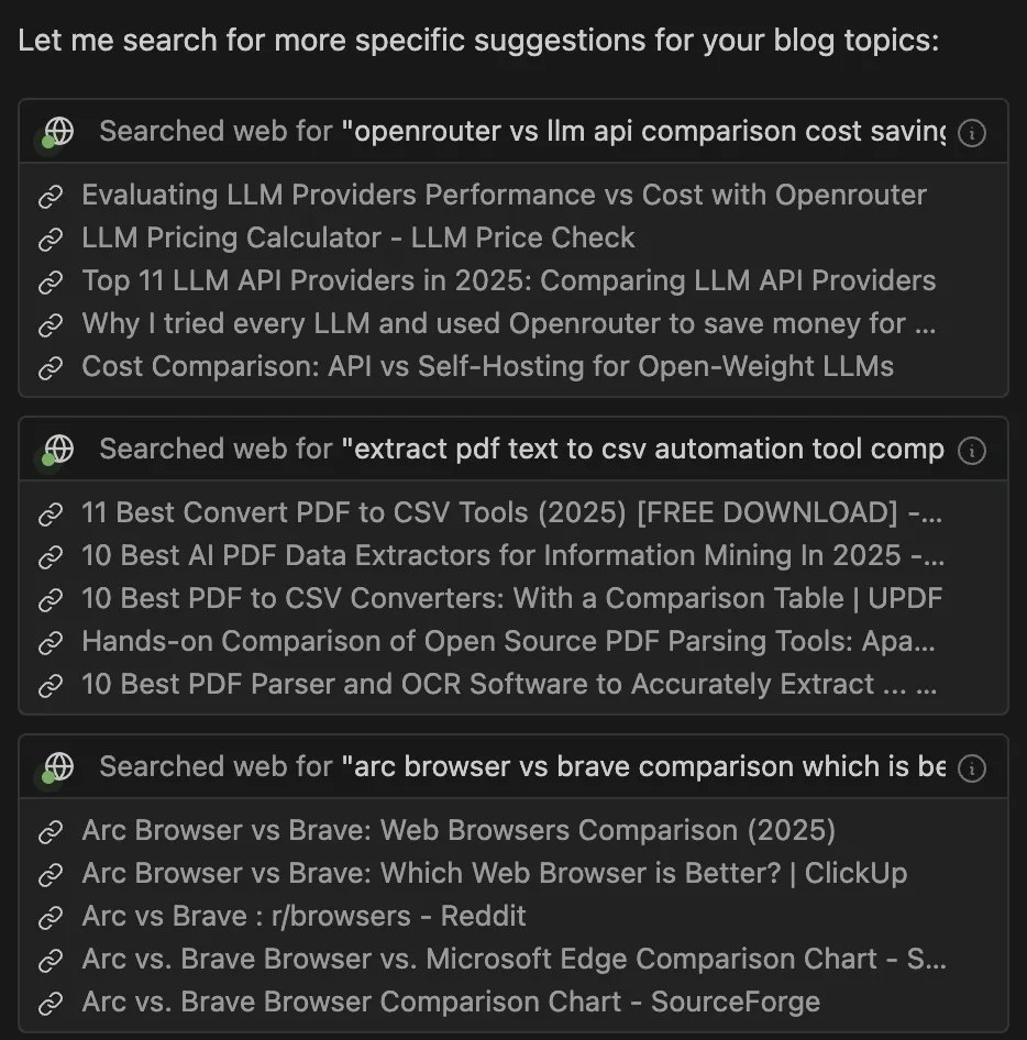 Batch processing: I loaded all 25 article topics into Windsurf and let it run overnight to gather suggestion data