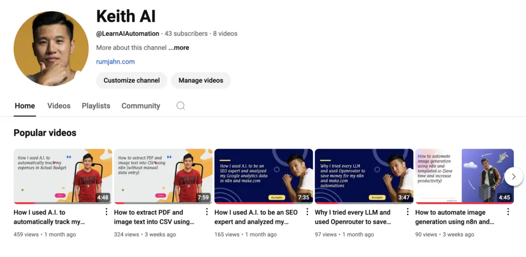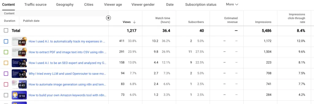 - Your most successful video "How I used A.I. to automatically track my expenses in Actual Budget" (411 views) is 288 seconds (~5 mins)