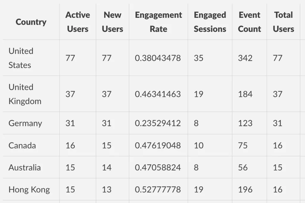 Please analyze and compare the Google Analytics report for the past 30 days on Total sessions and Users per Country with the report for the prior month to determine information like: