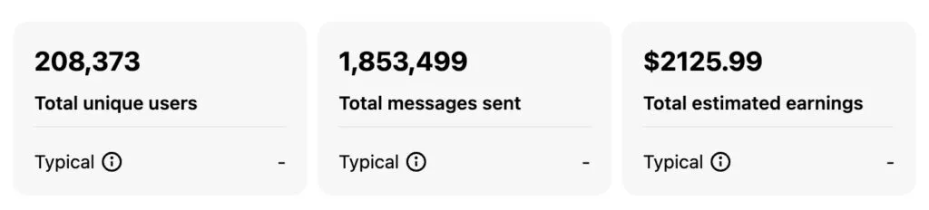 Top-tier example: 1,317.87from103,044messages=roughly1,317.87 from 103,044 messages = roughly 1,317.87from103,044messages=roughly0.0128 per message