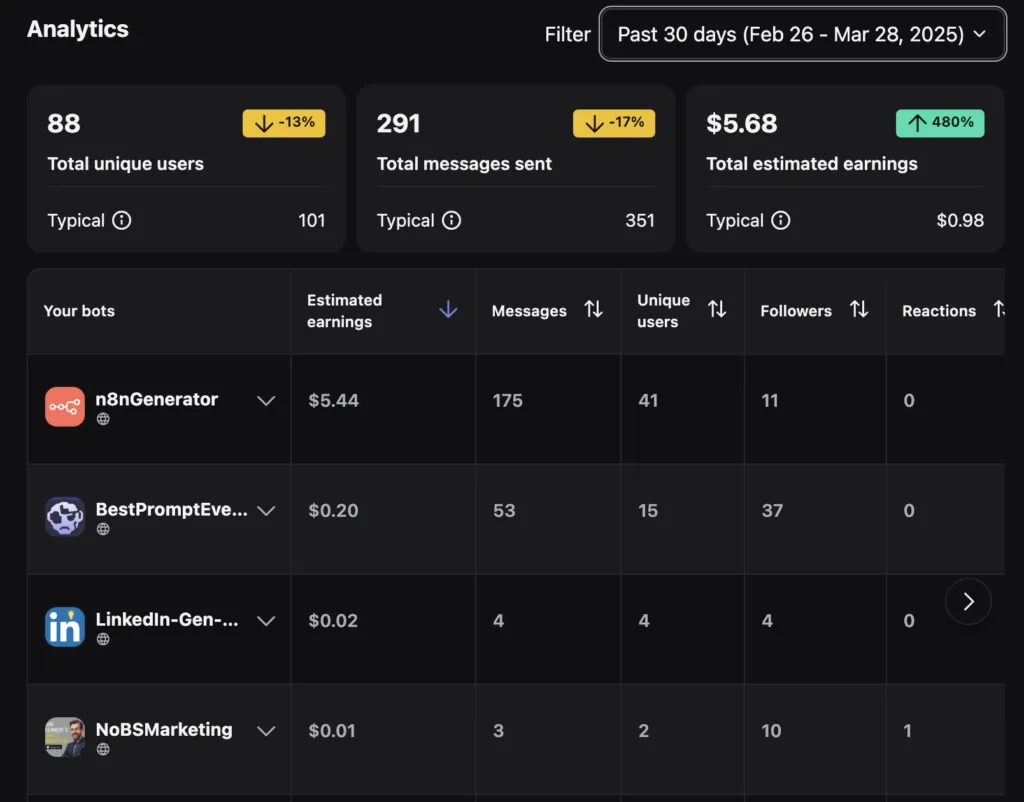 The most profitable bots tend to solve specific problems rather than offering general conversation. Looking at our data, the highest-earning bot in the 30-day snapshot was “n8nGenerator” at $5.44, which likely helps users create automation workflows—a specific utility that drives repeated use.
