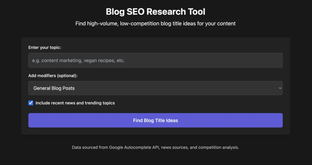The finished “Blog SEO Research Tool” transformed my content planning process. Instead of guessing which topics might perform well, I now have data-informed suggestions right at my fingertips.