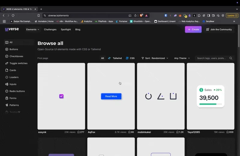 Uiverse.io is the first secret weapon in your arsenal. It’s an open-source collection of HTML/CSS components that look professional right out of the box. We’re talking: