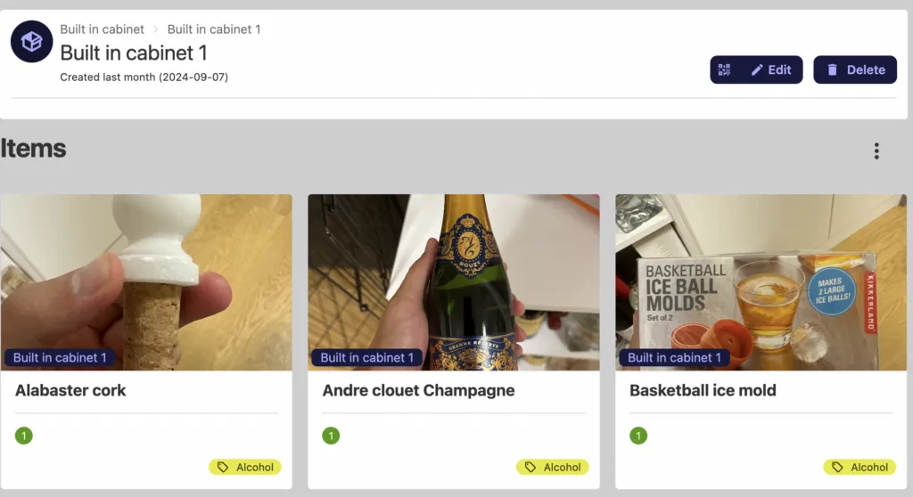 The item is automatically tagged with the location (e.g., “Kitchen Cabinet 3”).
