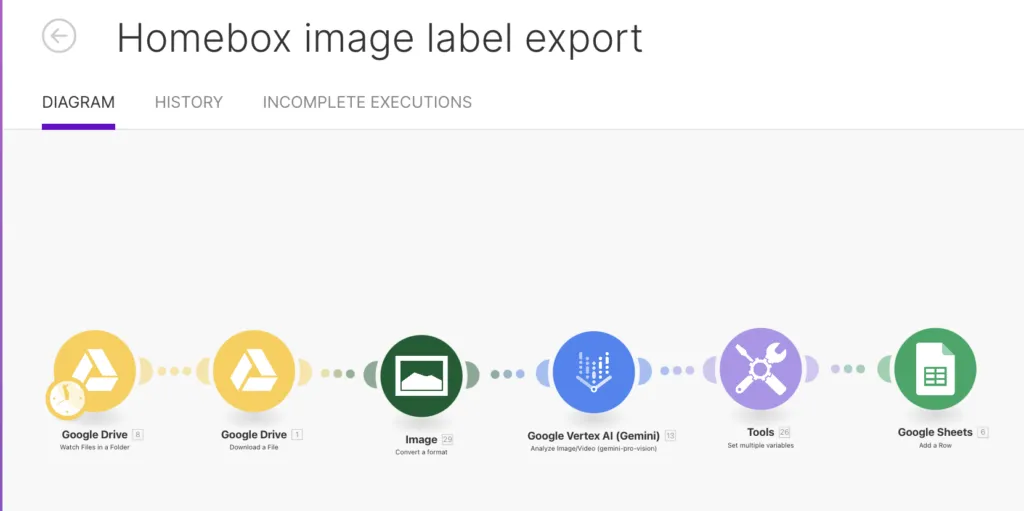The workflow takes the Gemini-generated description and creates a new item in Homebox.