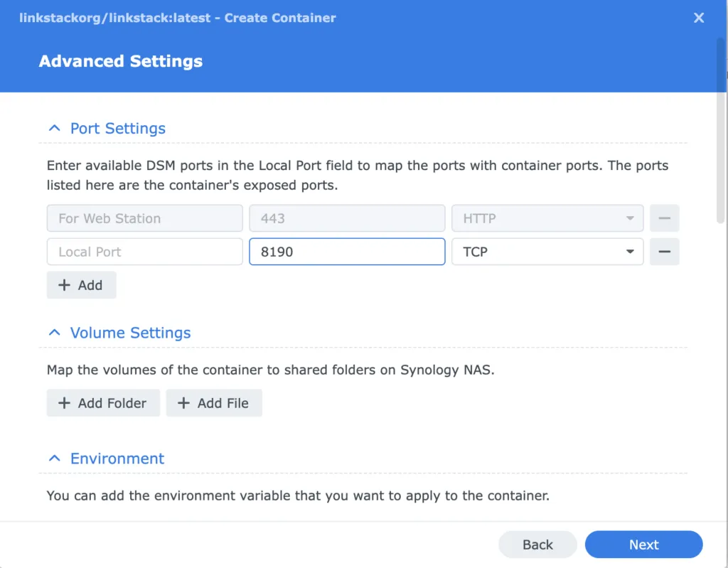 Set your local port to 8190. Click next. Select HSTS and set your hostname to linkstack.yourname.synology.me. This should allow you to install linkstack.