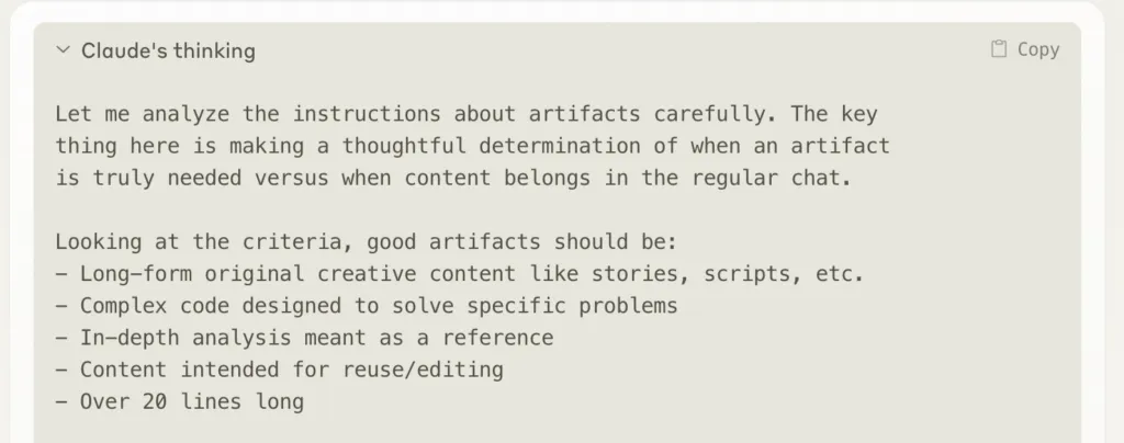 The ultimate goal of having thinking protocol is to enable Claude to produce well-reasoned, insightful and thoroughly considered responses for the human. This comprehensive thinking process ensures Claude's outputs stem from genuine understanding and extremely careful reasoning rather than superficial analysis and direct responses.