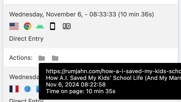 The feature I love the most is that I can see what every single person is doing. You can see above that someone from the USA spent 10 minutes reading my blog on an android phone. I can see every action per user. Insane stuff.