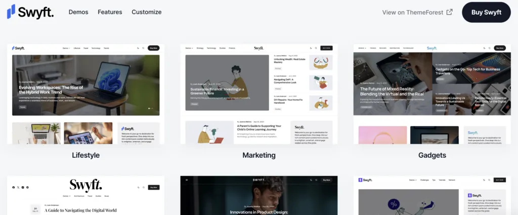 Visit StudioPress, ThemeForest, or Swyft’s website to purchase. Install your chosen theme, and transform your WordPress site today.