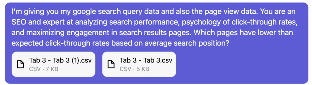 “You are an SEO and expert at analyzing search performance, psychology of click-through rates, and maximizing engagement in search results pages. Which pages have lower than expected click-through rates based on average search position?”
