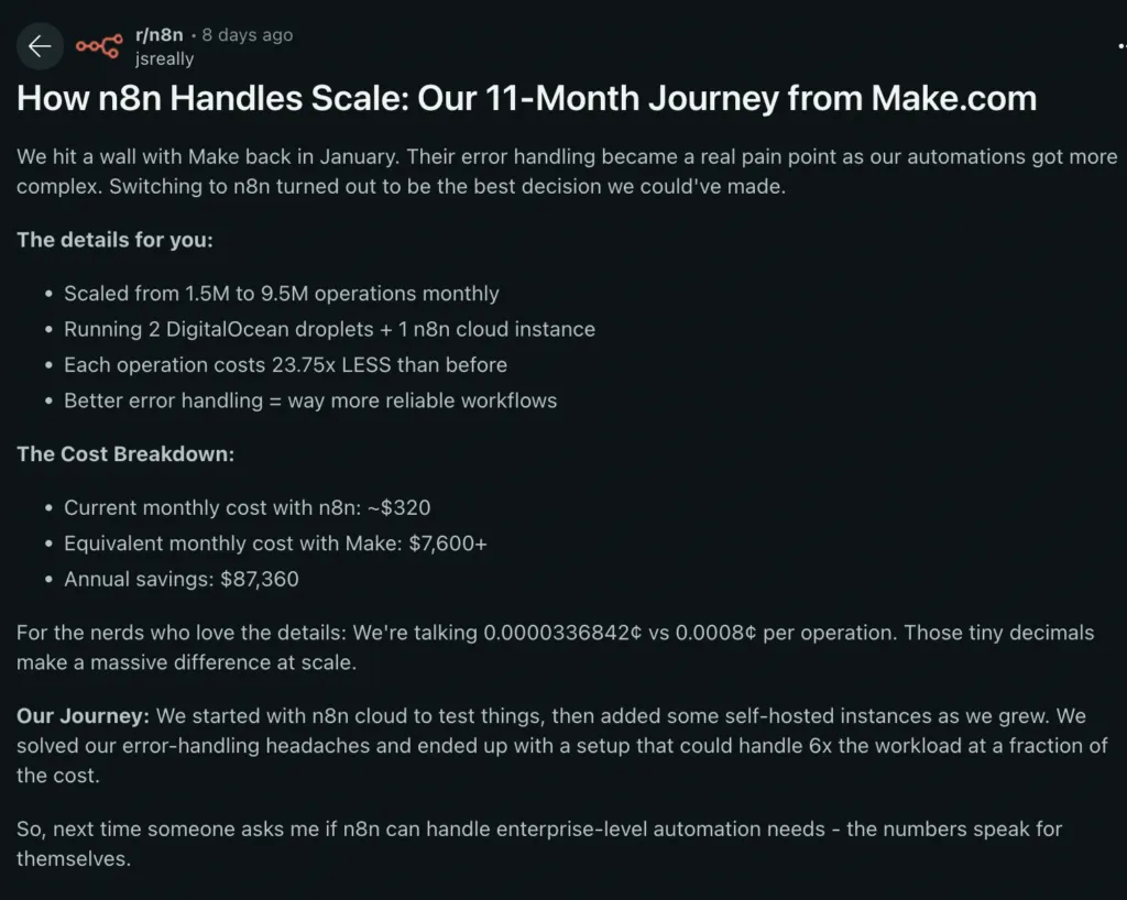 For me, switching to n8n was worth it. I maintain full control of my automations and save over $1,000 yearly. That’s real money back in my business.